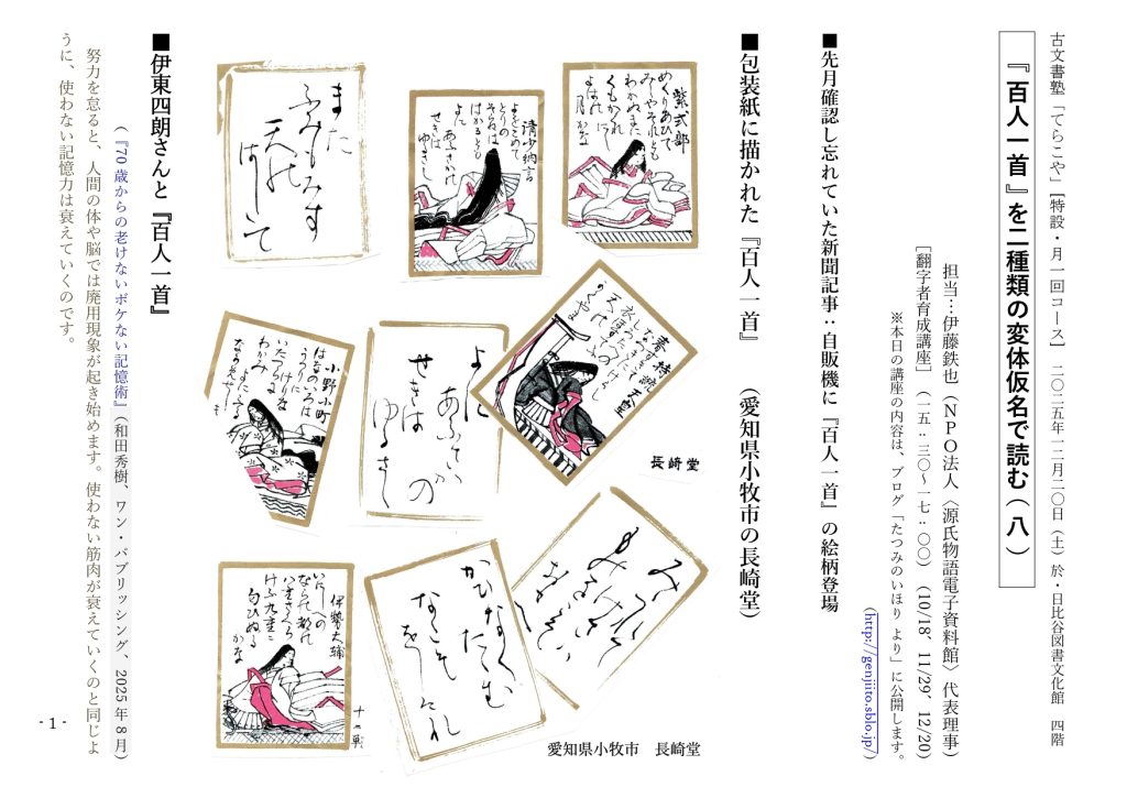 日比谷講座配布資料10月ー12月 投稿日: 2025年11月30日2026年1月17日 投稿者: npo202010月18日(土)「須磨」『百人一首』11月29日(土)「須磨」『百人一首』2025年12月20日(土)「須磨」『百人一首』